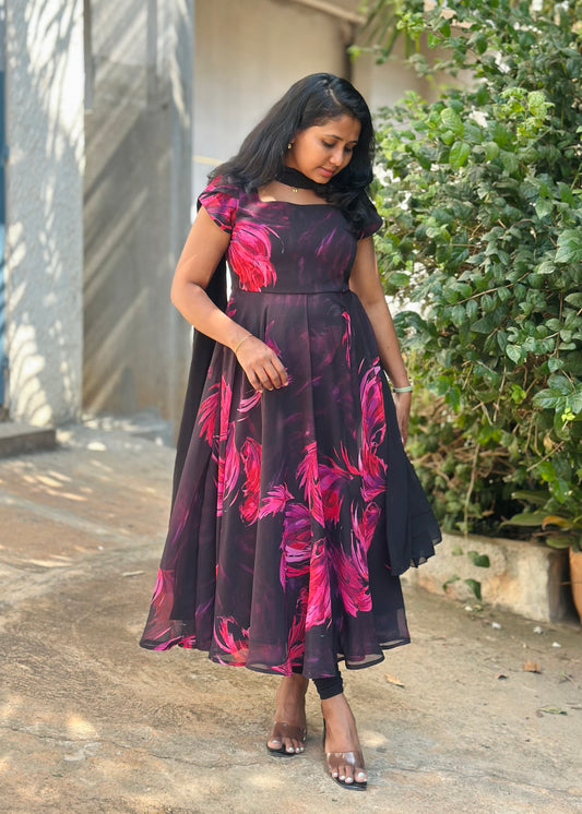 Black with Pink feather print Anarkali