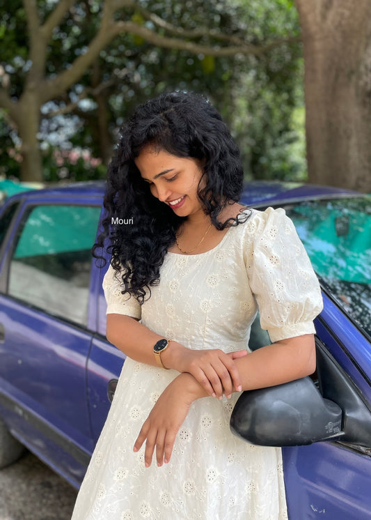 Sold outNihira Off White Schiffli Midi Dress