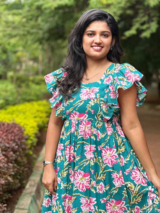 Jolene Teal Floral Printed Cotton Midi Dress