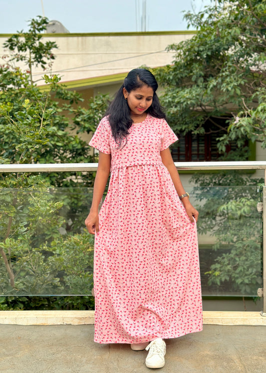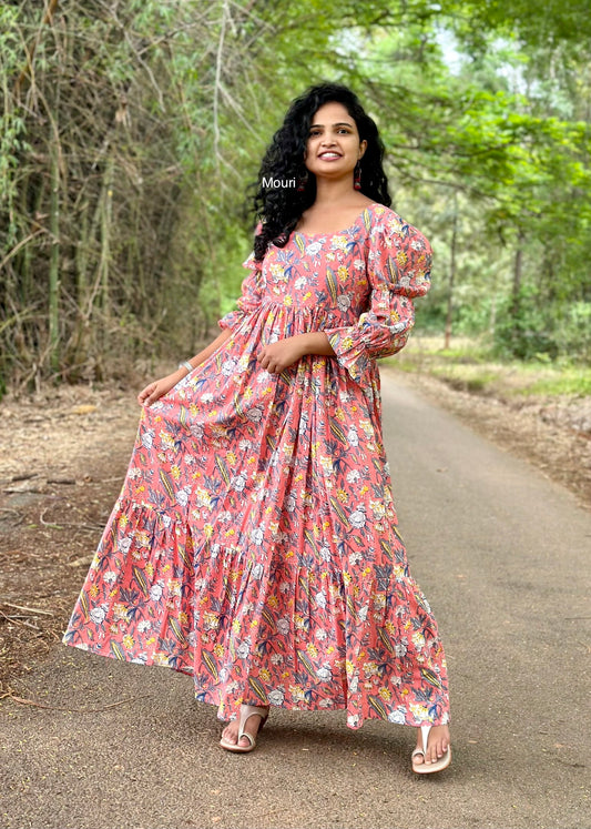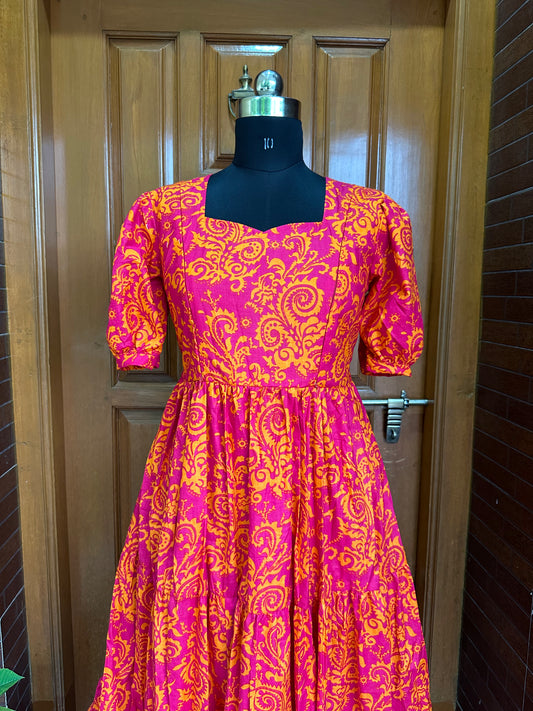 Pink with Orange Print Cotton Maxi Dress