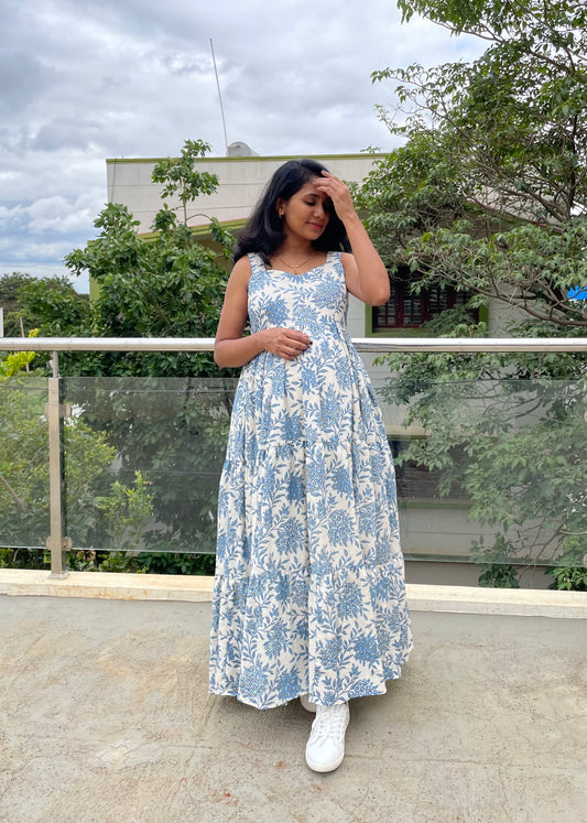Hayley Blue Printed 3 Tier Cotton Maxi Dress