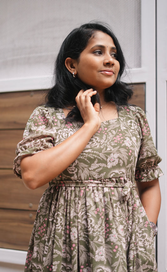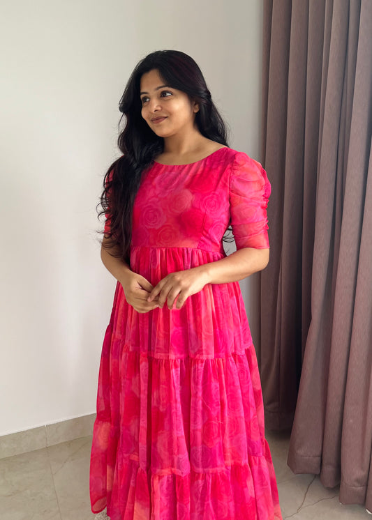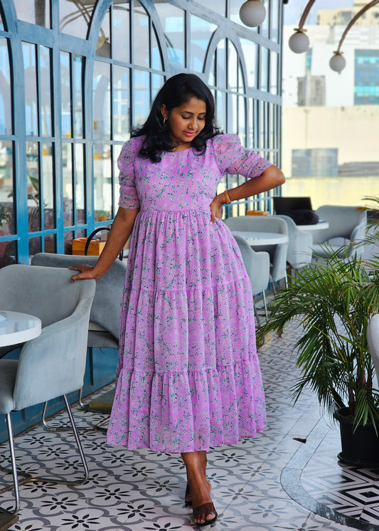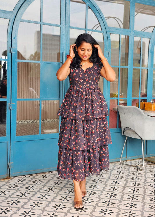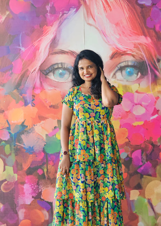 Green Petals 3 Tiered Georgette Dress