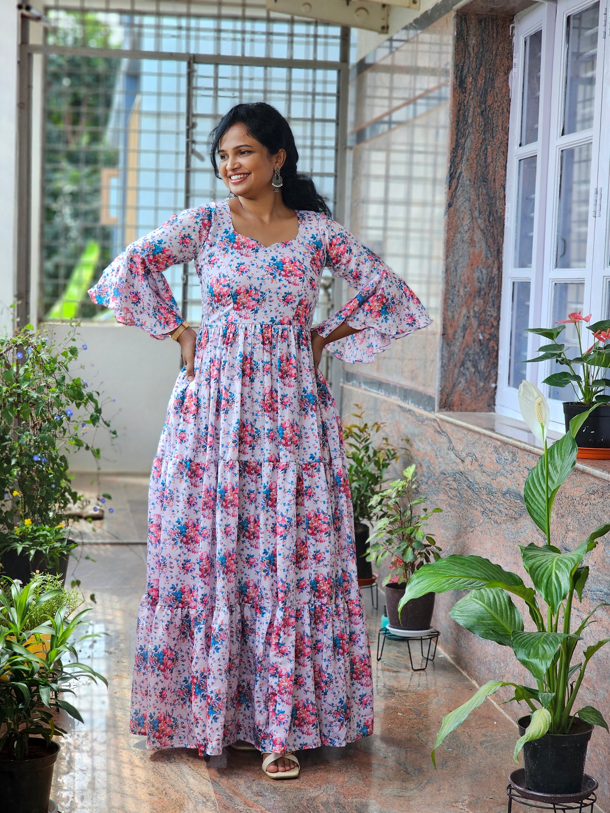 Style: 3-tiered flared maxi dress for a flowy and graceful appeal includes 2 side pockets.
