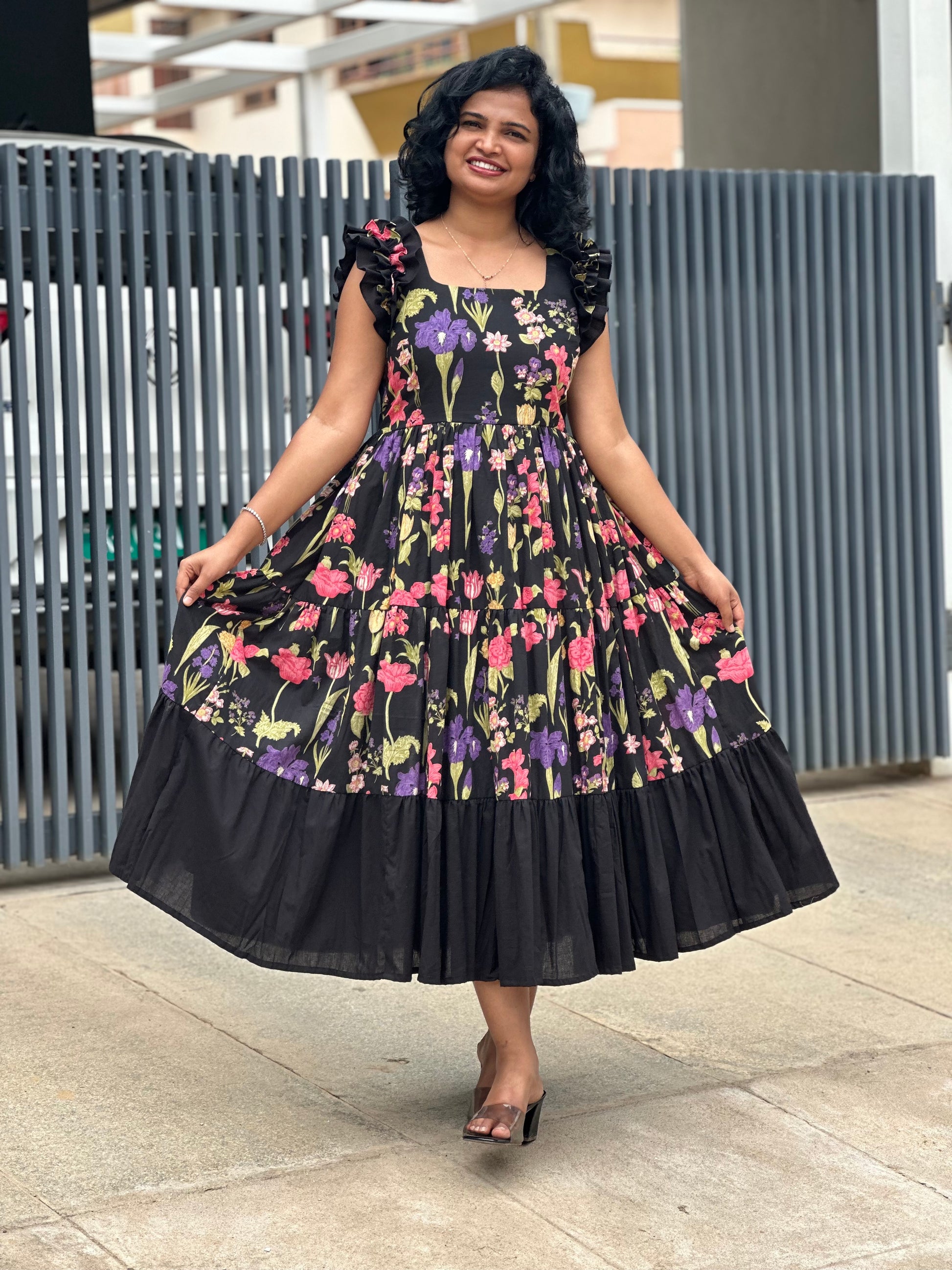 - Color: black base adorned with multi color floral
