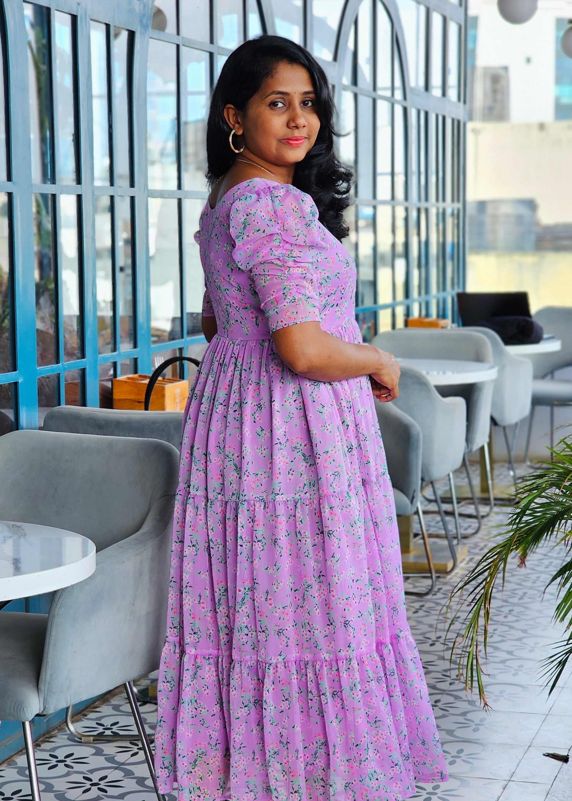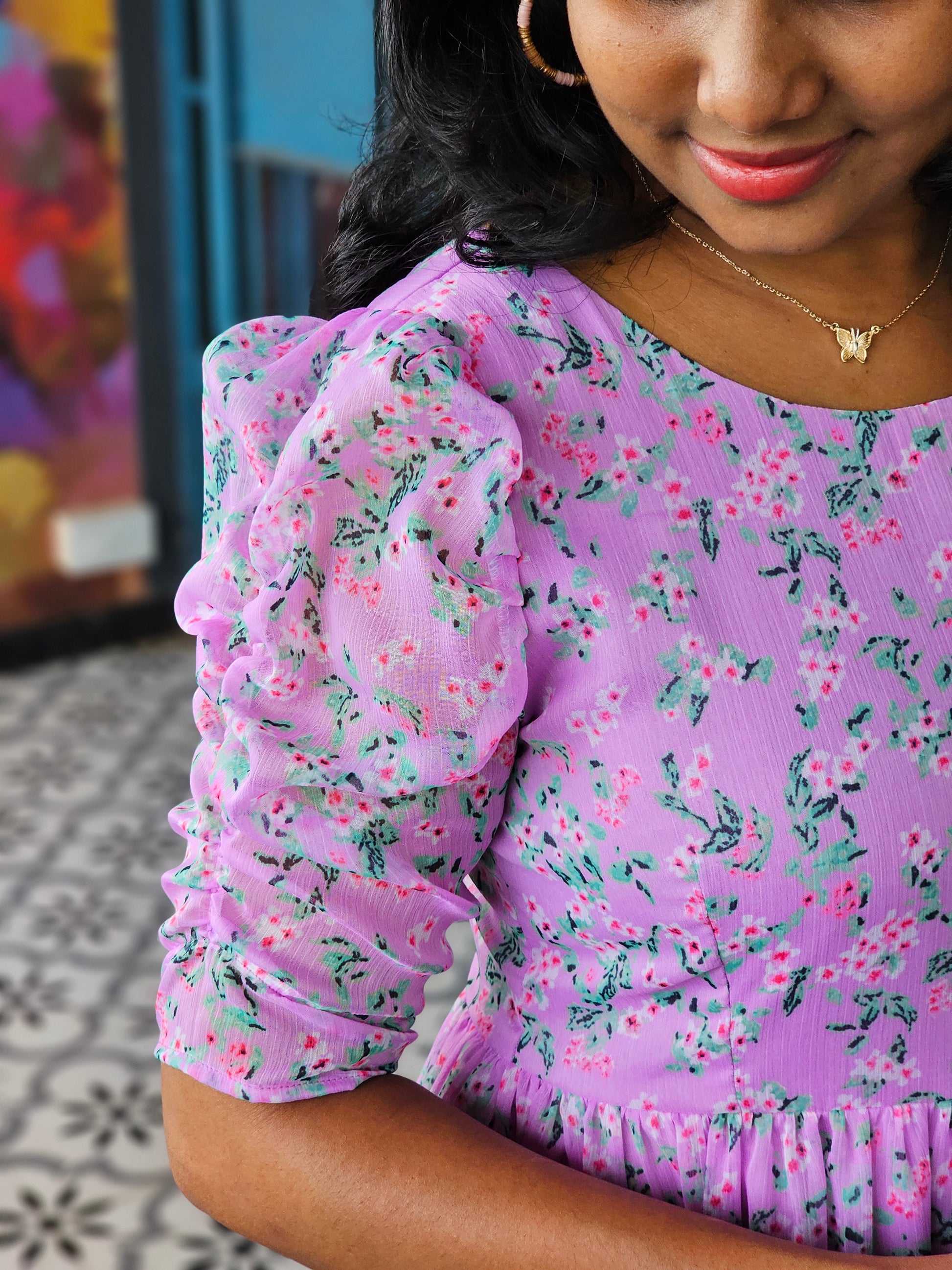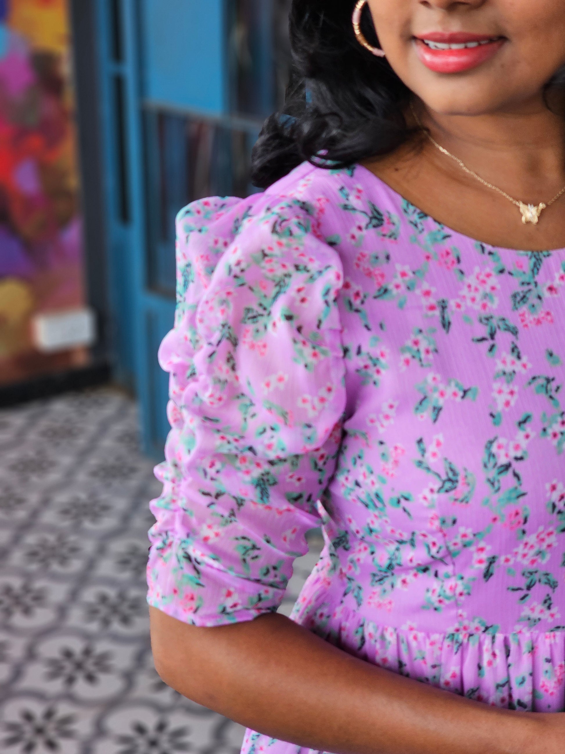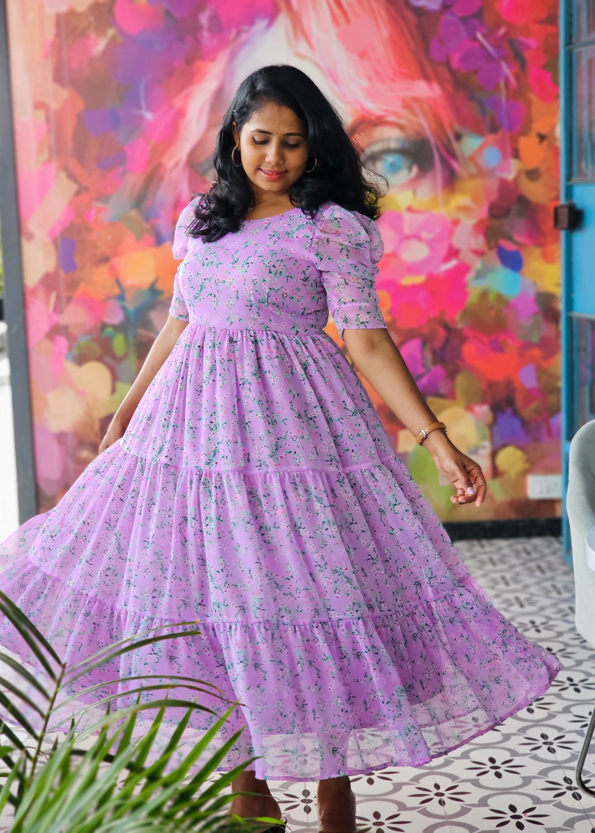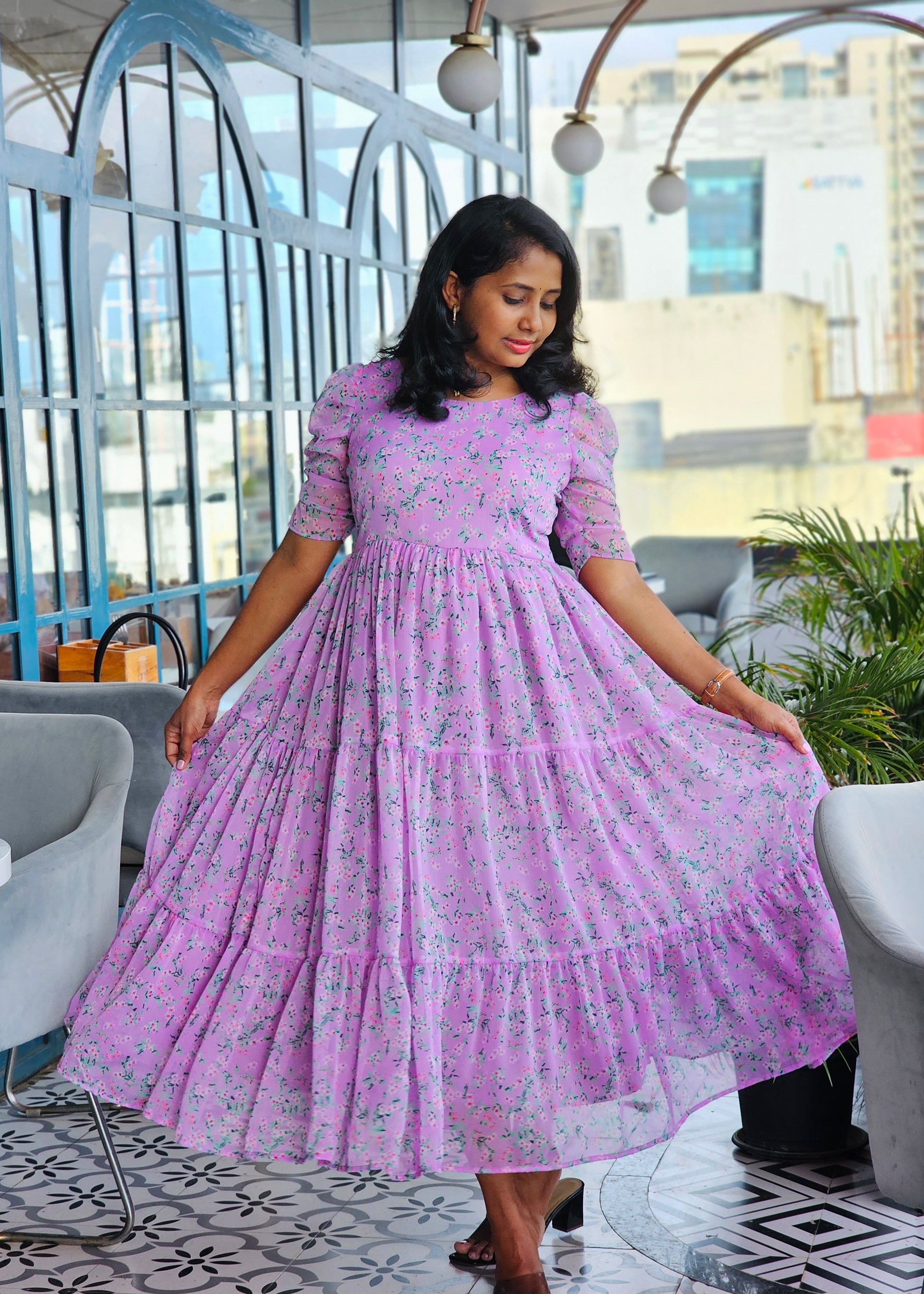 - Color: Soft lavender base with delicate floral prints in pastel shades