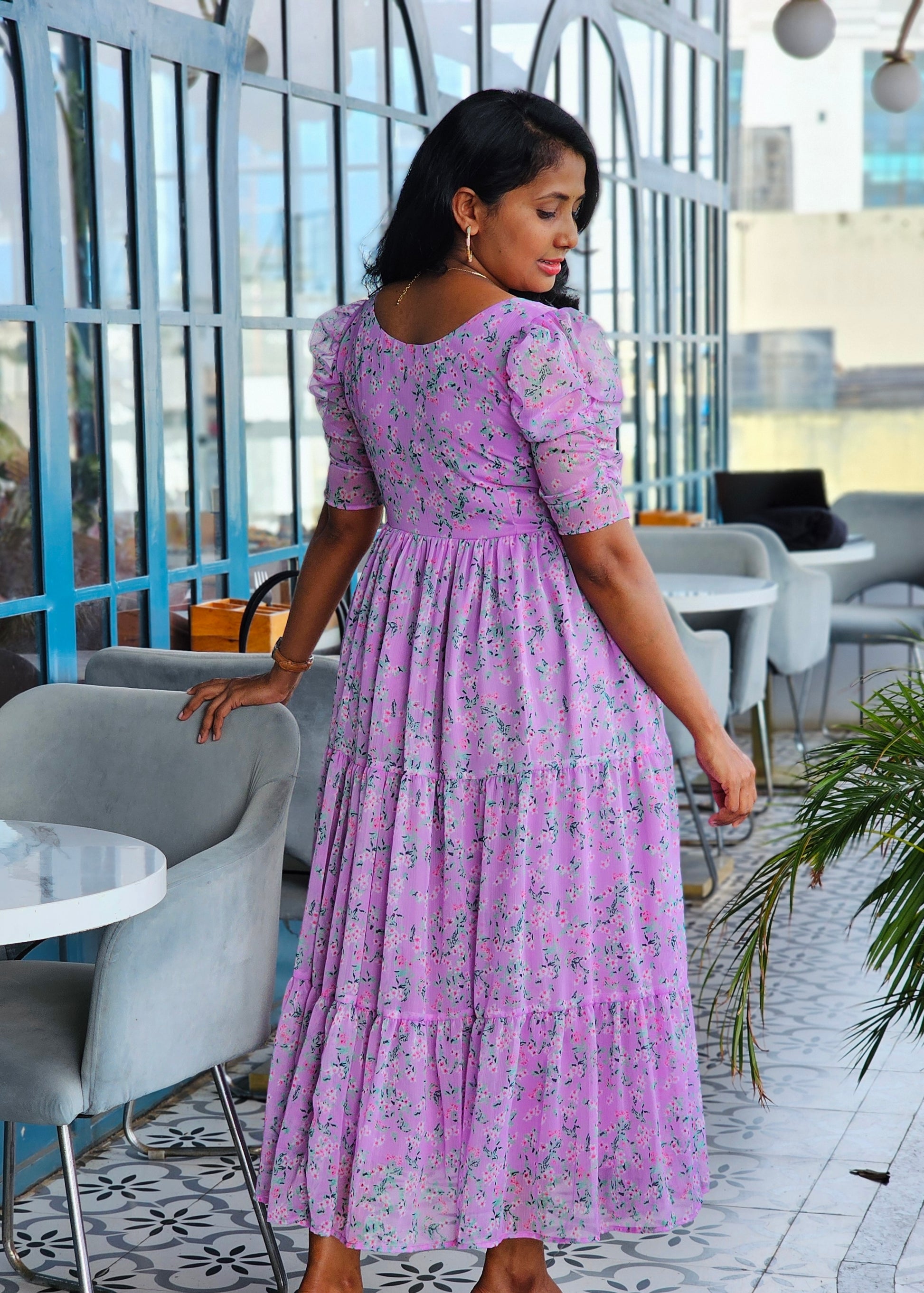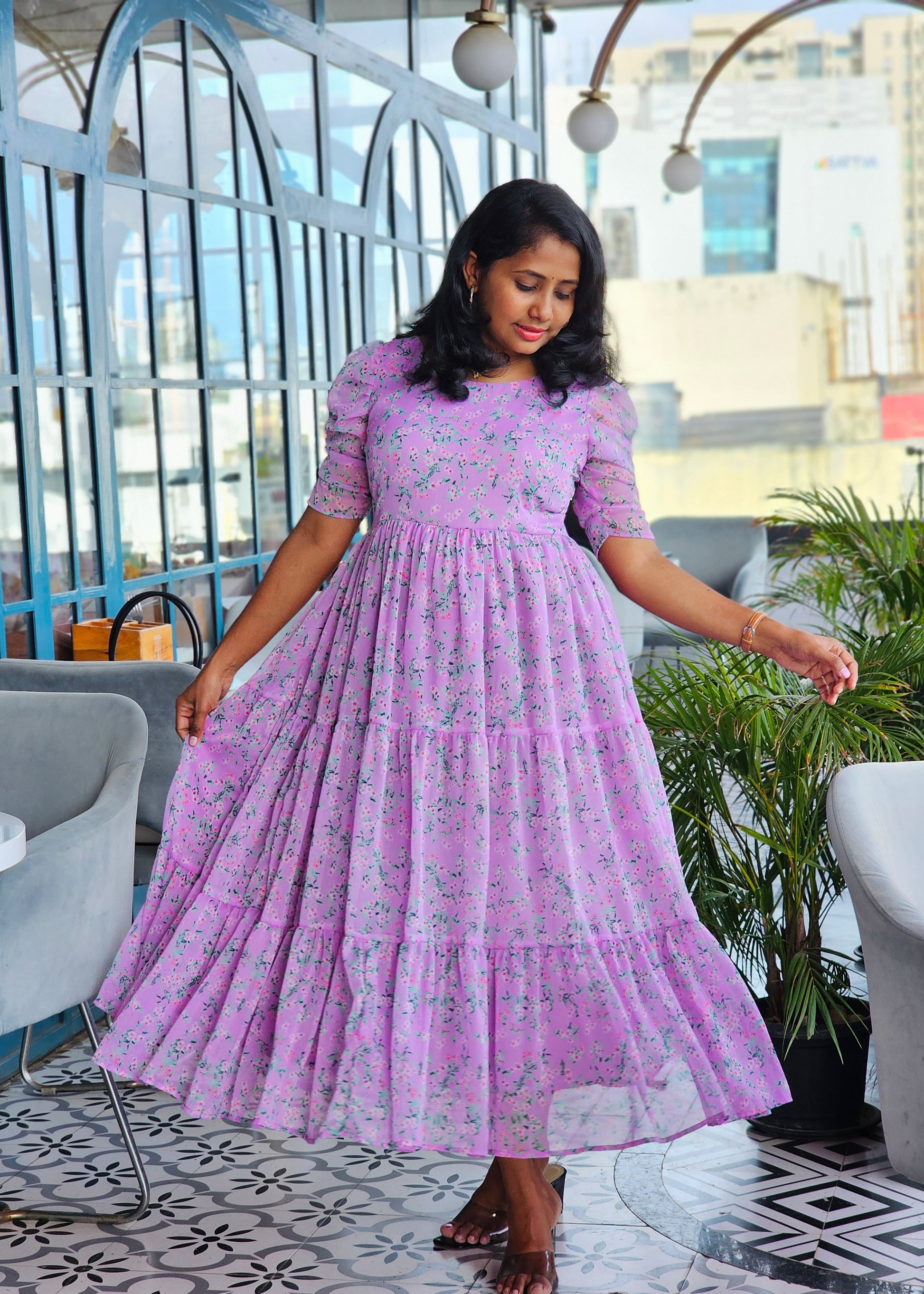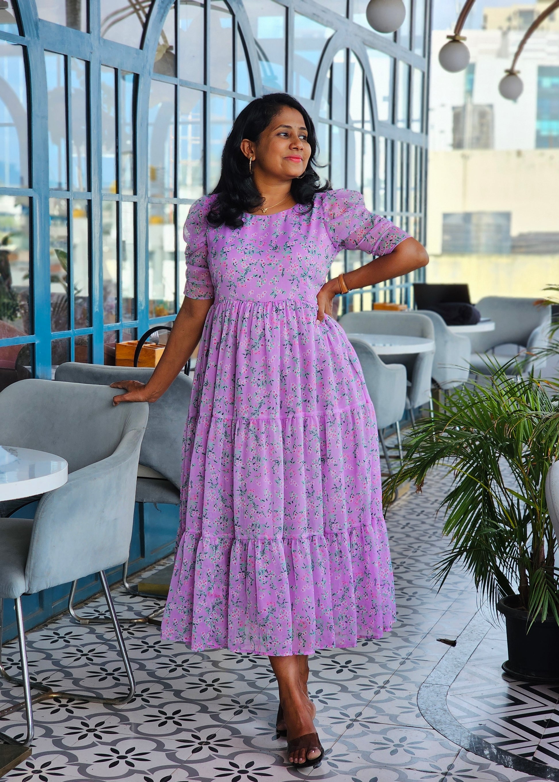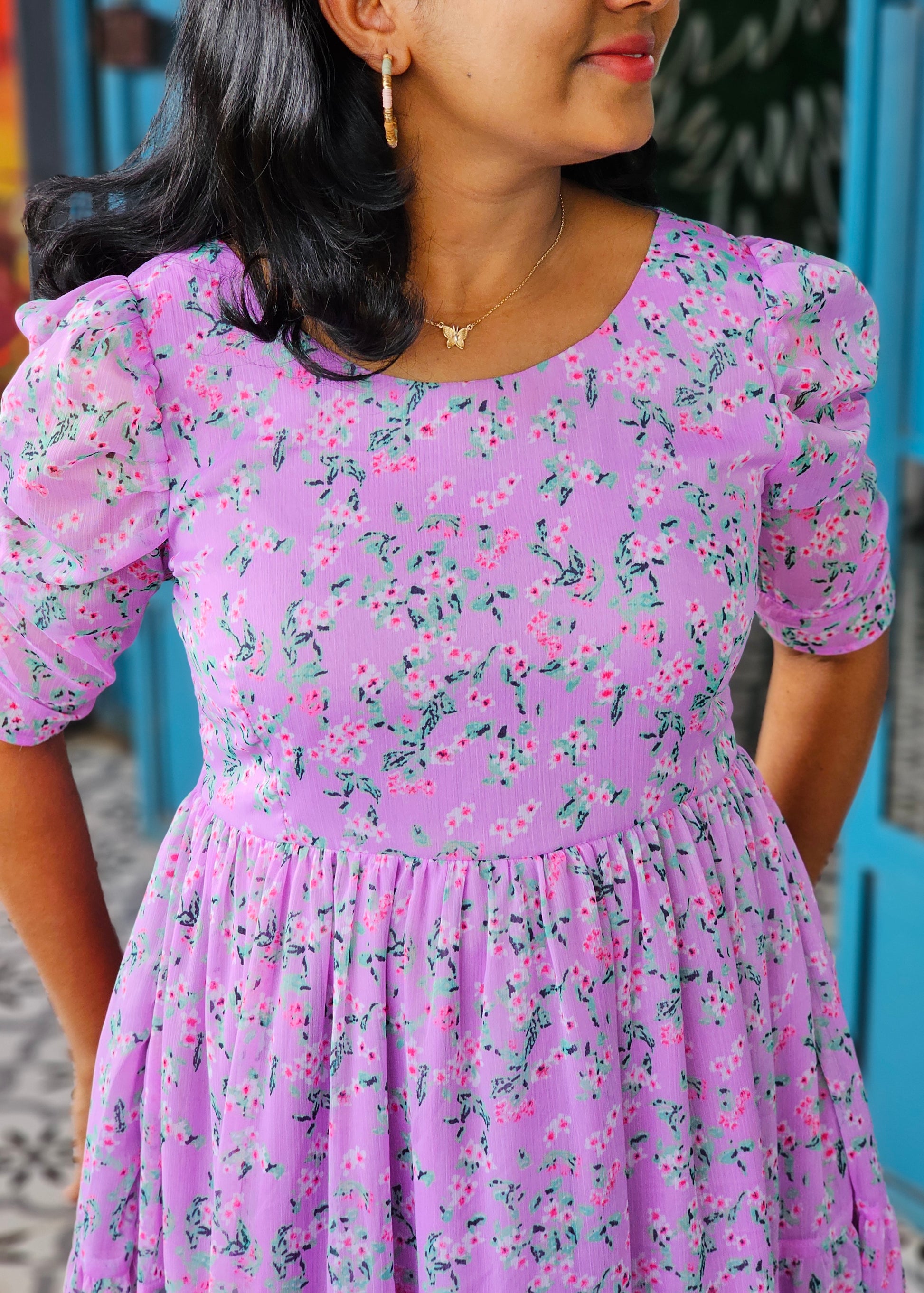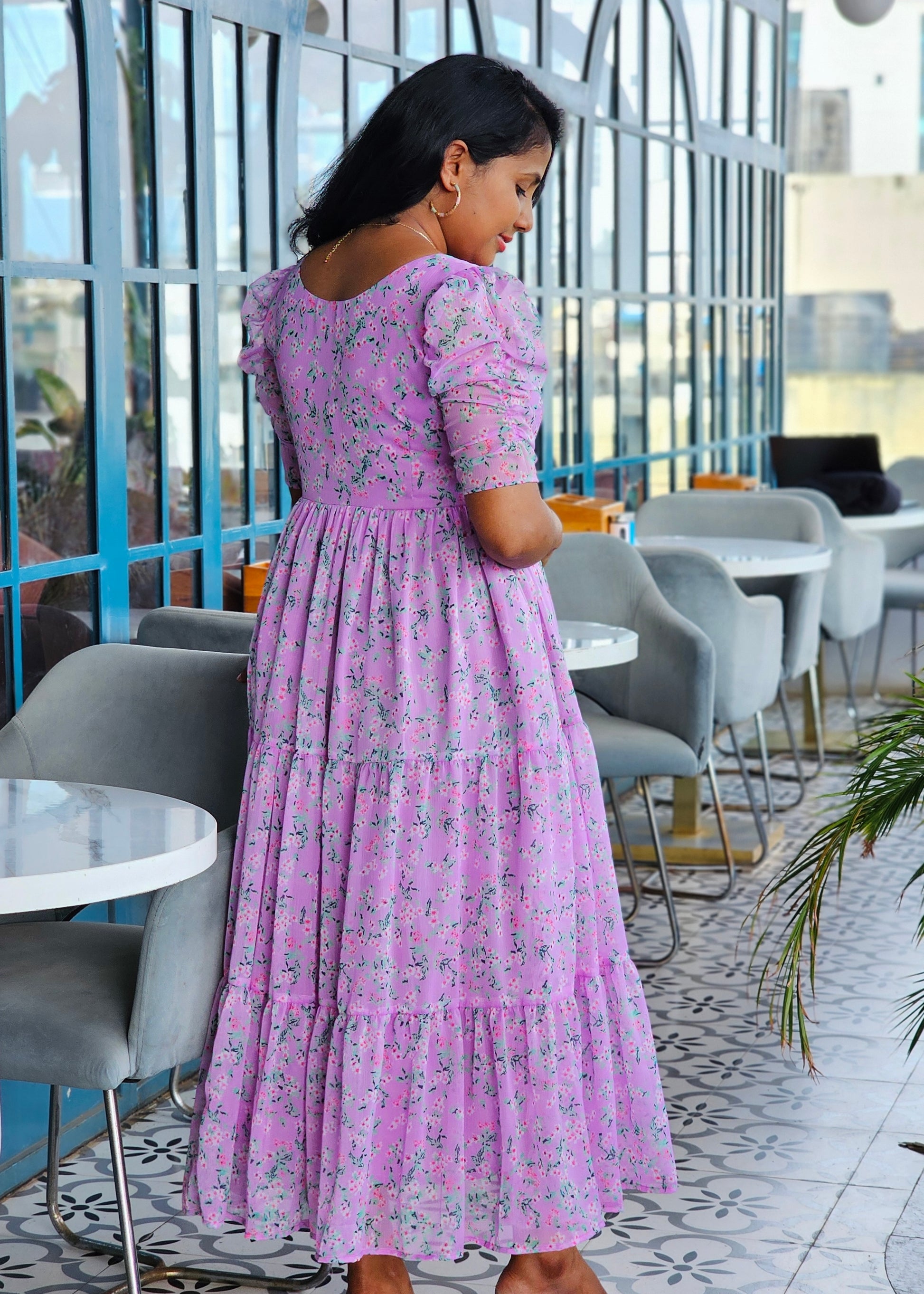 - Color: Soft lavender base with delicate floral prints in pastel shades