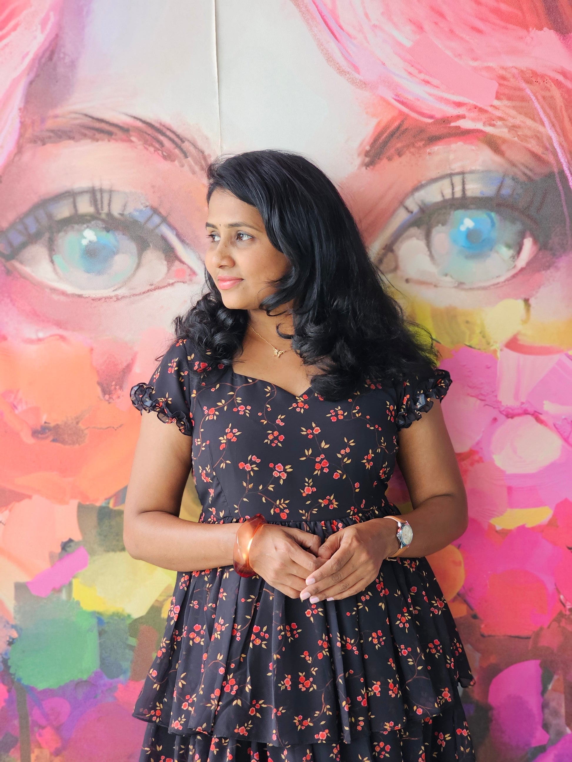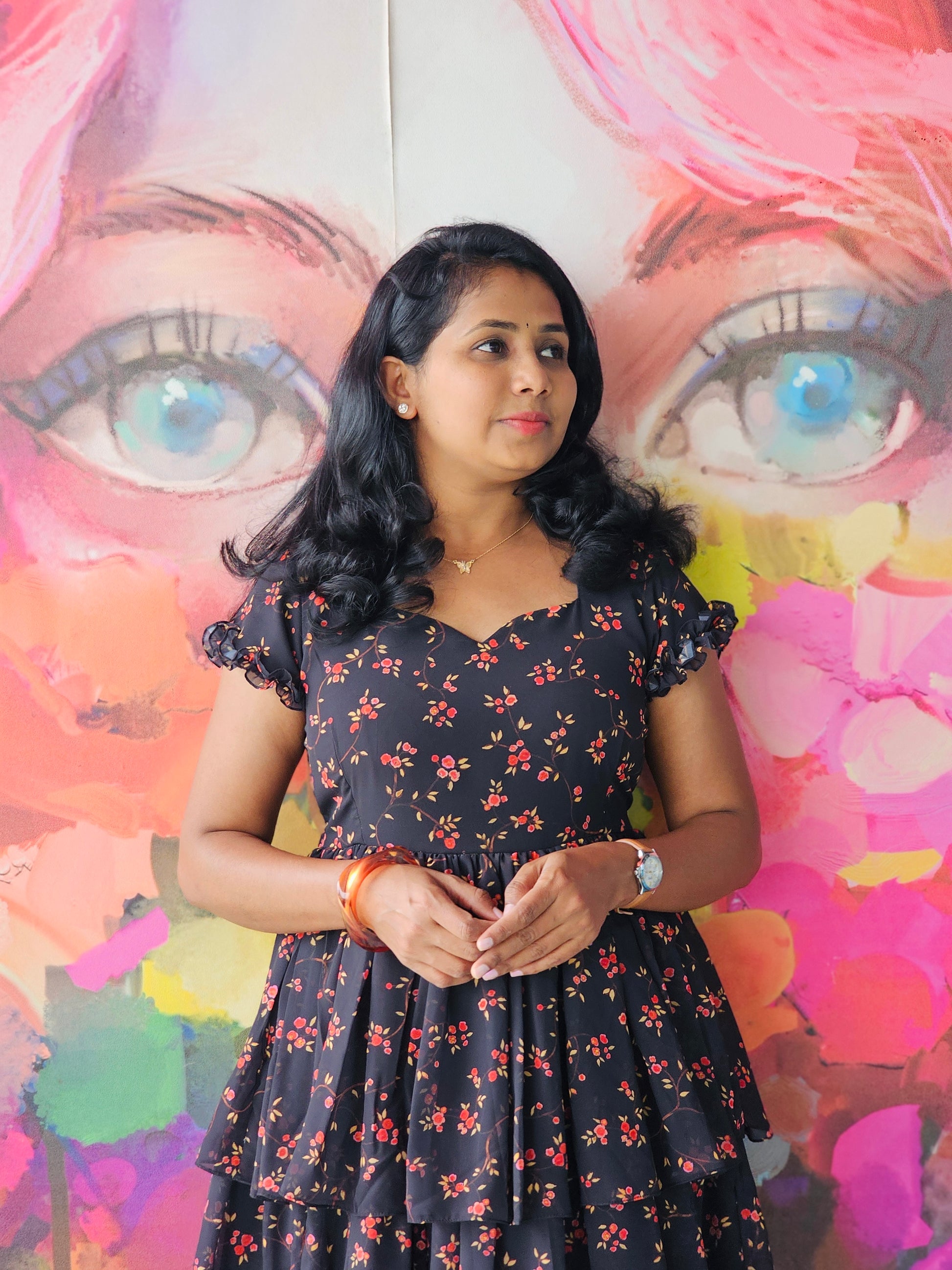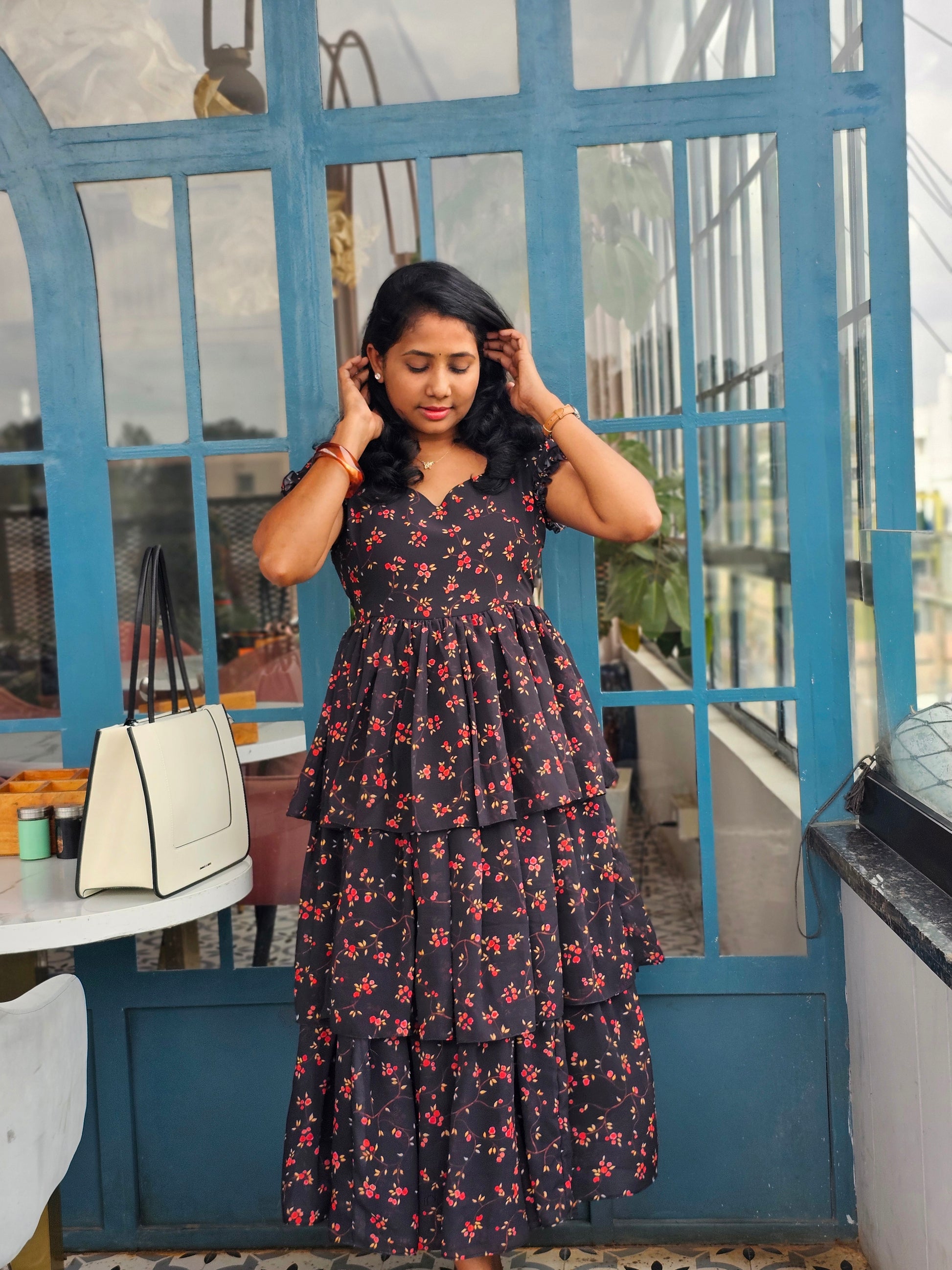 - Colour : Soft black base with delicate red floral prints